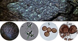 Μορφολογία: Παράγει μικρά, άμισχα, στρωματοειδή, επίπεδα, πιεσμένα, συχνά διάτρητα-δικτυωτά, γκρίζα, γκριζολευκωπά ή ιριδίζοντα πλασμωδιοκάρπια (μήκους 0,2-1 (4) εκ. και πάχους 0,1-0,15 χιλ.) με λεπτό, μεμβρανώδες πηρίδιο από αστερόμορφους, σταυρόμορφους ή ακανόνιστους κρυστάλλους ανθρακικού ασβεστίου, δυσδιάκριτο υπόθαλλο, άφθονο διάπλεγμα κόμης από λεπτά ή φαρδύτερα -στα σημεία ένωσης με τις κύστεις-, λεία, κιτρινοκαφετιά, διακλαδιζόμενα-αναστομούμενα νήματα, που κατά τόπους σχηματίζουν δίχτυ, και αρκετές, μεγάλες, αμυδρώς στικτές, υποσφαιρικές κύστεις (K-7540: 29,2-55,5 x 24-47,85 μm) με κίτρινο ή γκριζοκίτρινο, κοκκώδες περιεχόμενο, κίτρινο πλασμώδιο, σφαιρικά, καφεβιολετιά, αμυδρώς στικτά σπόρια (β: 8-10 (11) μm, K-7540: 8,75-11,35 (13,15) x 7,8-10,75 μm) και καφετιά σποριόμαζα.