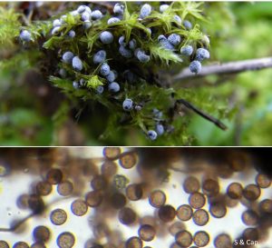 Μορφολογία: Παράγει πολύ μικρά, άμισχα ή συνήθως έμμισχα, μερικές φορές συγκεχυμένα σποροκάρπια (-1 χιλ. ύψος) με βαθιά ομφαλοειδές (στη βάση), ημισφαιρικό ή ελαφρώς επίπεδο-πιεσμένο, λευκό, κρεμ ή γκρίζο σποριάγγειο (διάμ. 0,5-1 χιλ.) ή -σπανίως- με μορφή επίπεδου πλασμωδιοκάρπιου, με συνεκτικό, θαμπό, καφετί ή μαύρο πηρίδιο, λευκούς, αστερόμορφους πηριδικούς κρυστάλλους, κοντόχοντρο, κυλινδρικό, αυλακωτό, βαθύχρωμο καφετί, καφεμαυριδερό, μαυριδερό ή κοκκινοκαφετί πόδι, δυσδιάκριτο, βαθύχρωμο υπόθαλλο, εμφανή, ημισφαιρικό-ομφαλοειδή, καφετή ή -σπανίως- λευκό, ασβεστώδη κιονίσκο, διάπλεγμα κόμης από λεπτά ή παχιά, απλά ή ελαφρώς διακλαδιζόμενα ή αναστομούμενα, ανοιχτόχρωμα καφετιά, κολπωτά-σγουρά νήματα, μερικές φορές με βαθύχρωμες καλυκόμορφες διογκώσεις, υαλώδες ή γκρίζο πλασμώδιο και σφαιρικά, καφεβιολετιά, σχεδόν λεία, στικτά ή εντόνως φυματώδη σπόρια (β: (9) 10-12 (14) (15) μm, BK-3940: 10,3-11,5 x 9,6-10,9 µm) και μαύρη ή καφετιά σποριόμαζα.